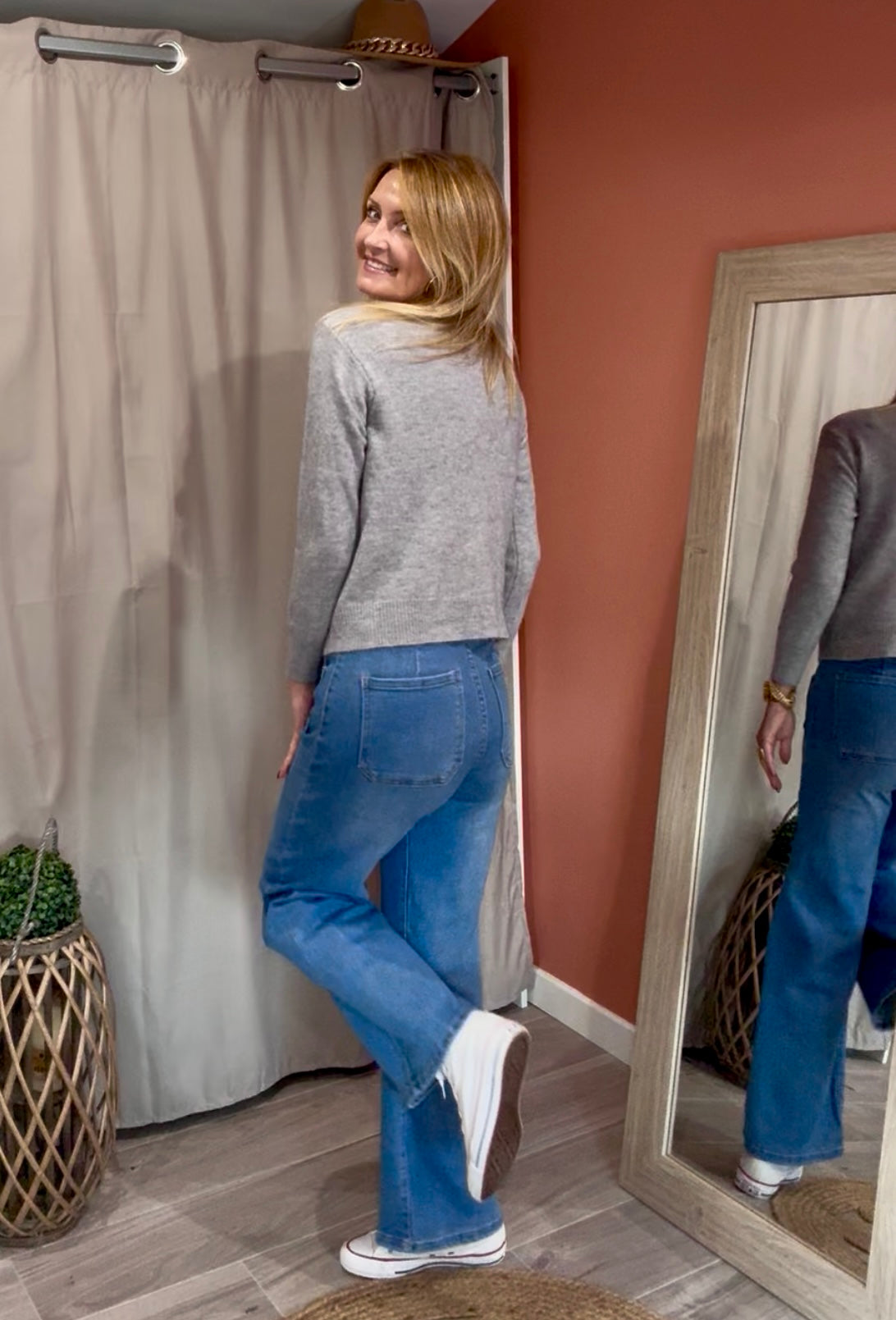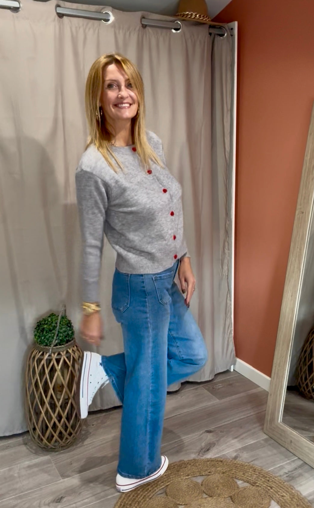Beaucoup de douceur pour ce cardigan gris à boutonnage cœur rouge et encolure ronde