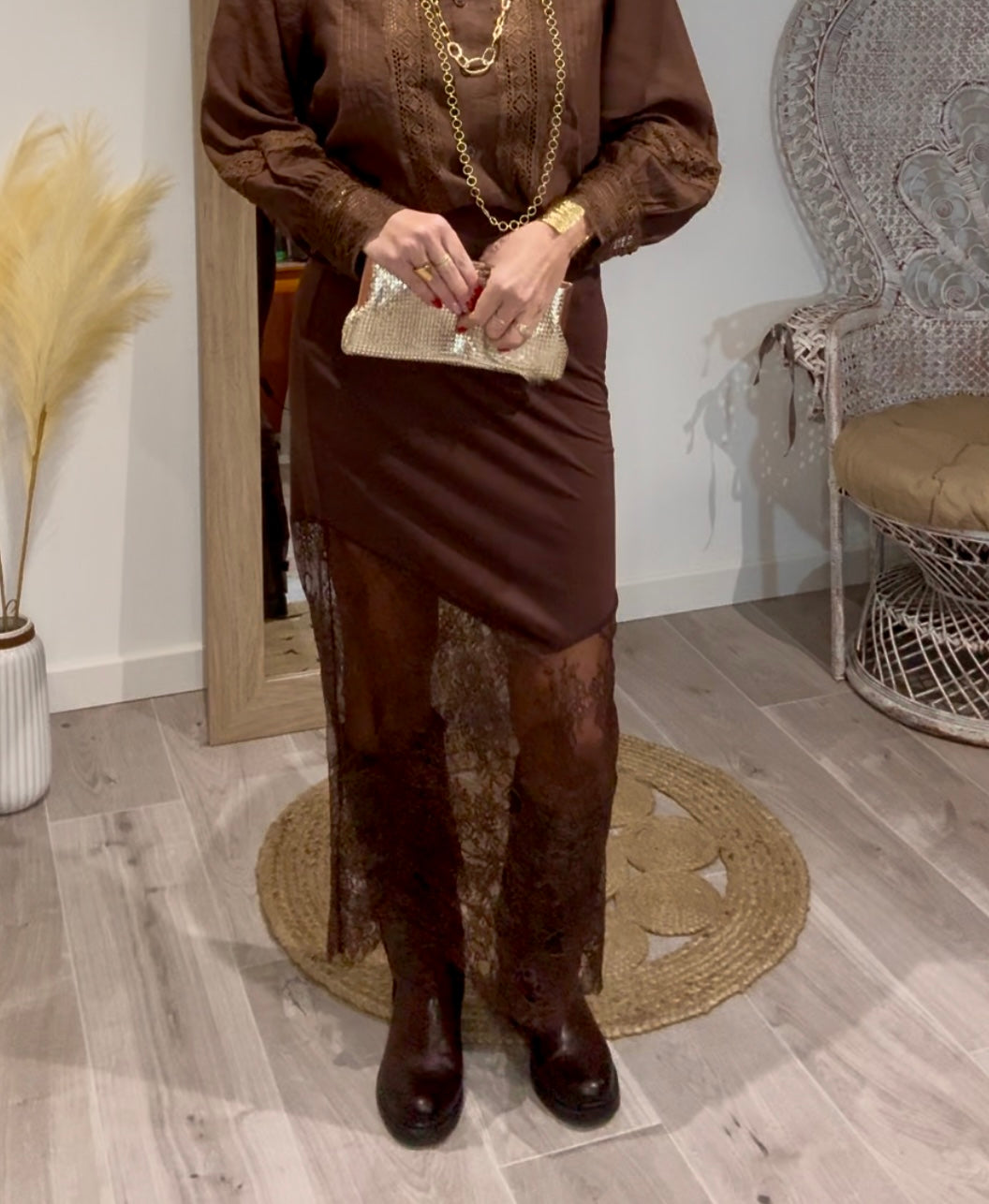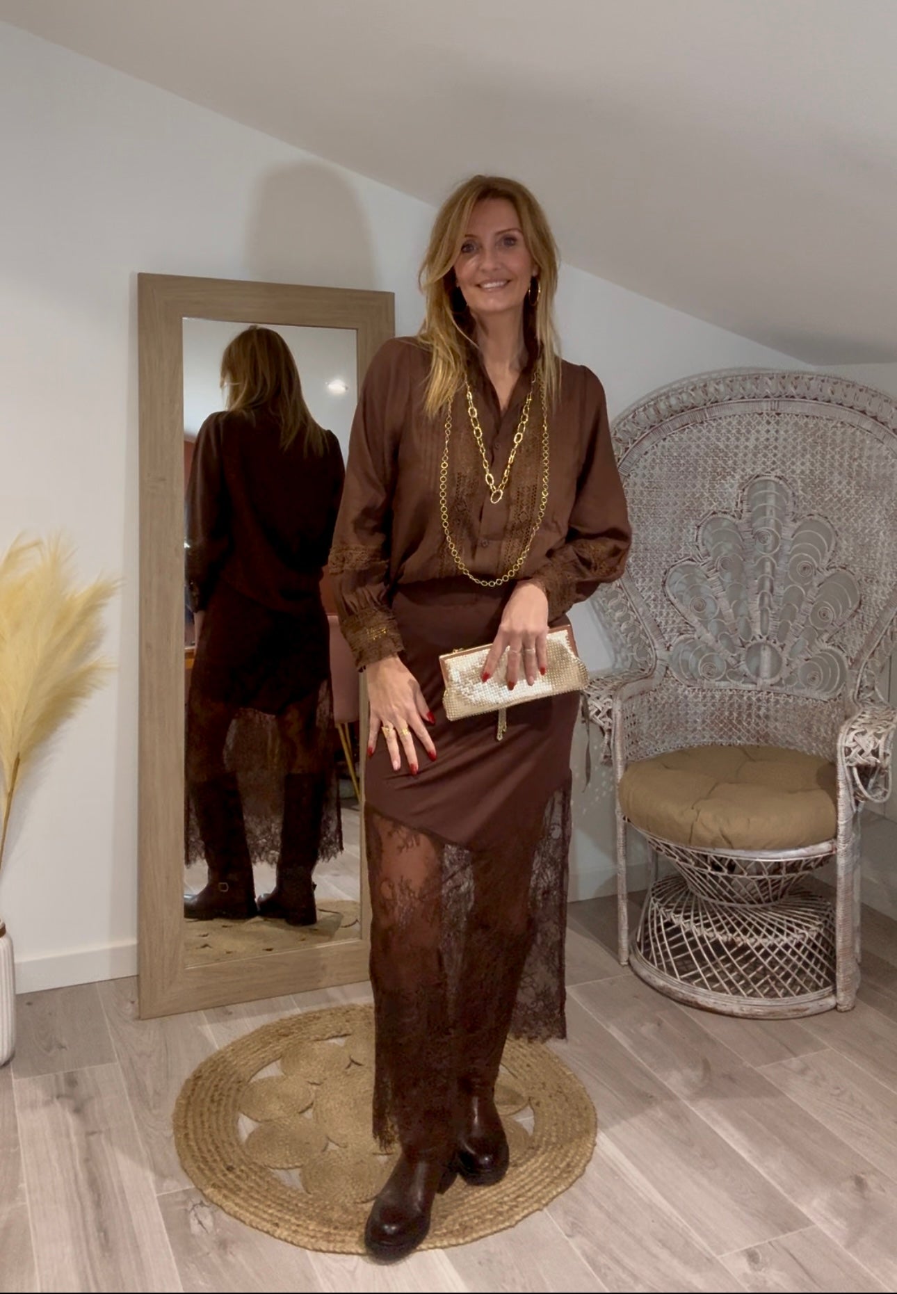 Jupe VÉNUS portée avec la chemise MOUSQUETAIRE chocolat