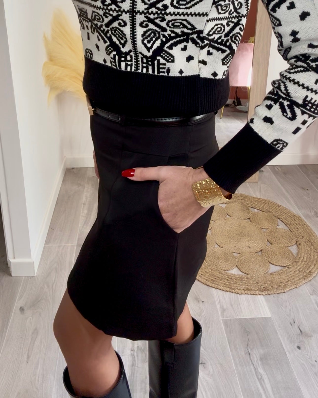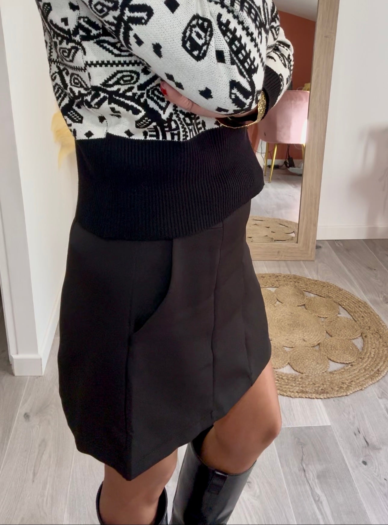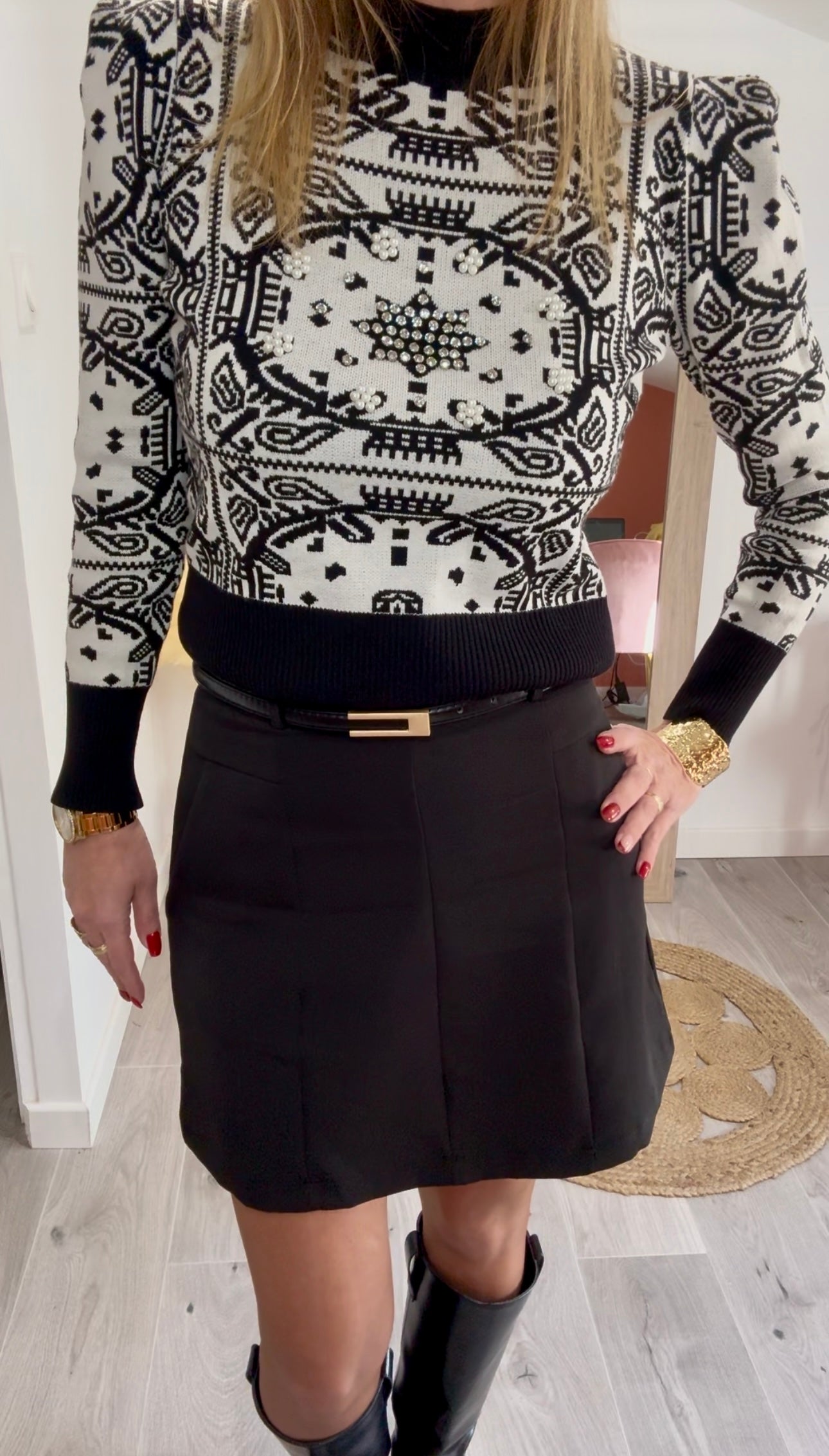 La jupe TRAPÈZE est portée avec le pull STARMANIA