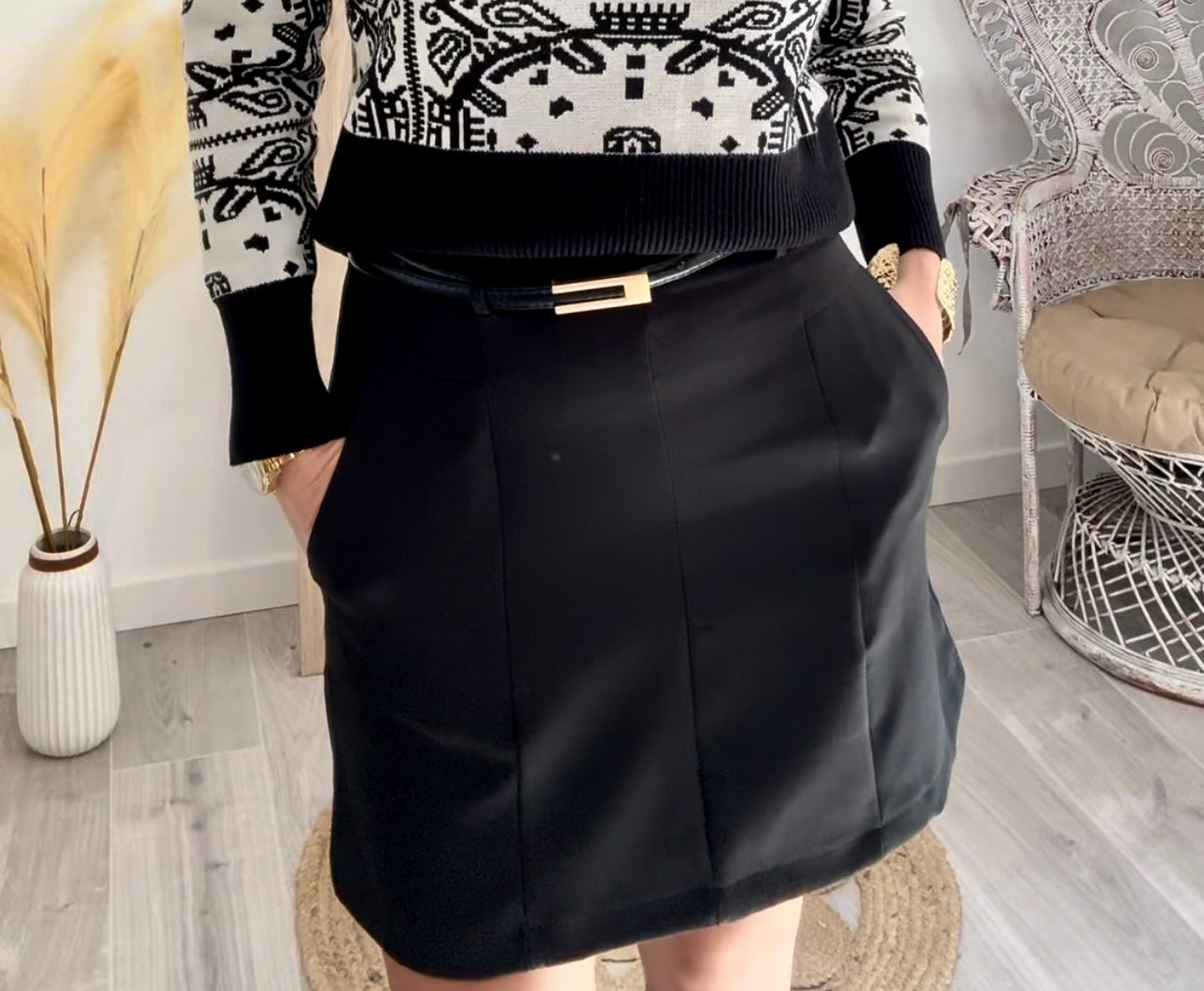 Jupe noire en tissu fin, 2 poches avant, fermeture éclair arrière, passant pour ceinture.