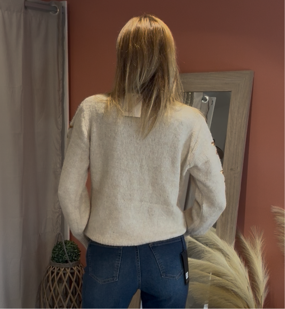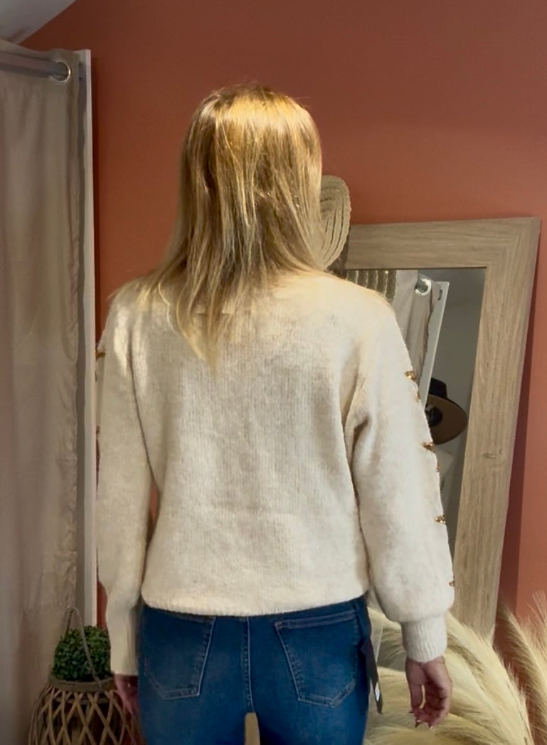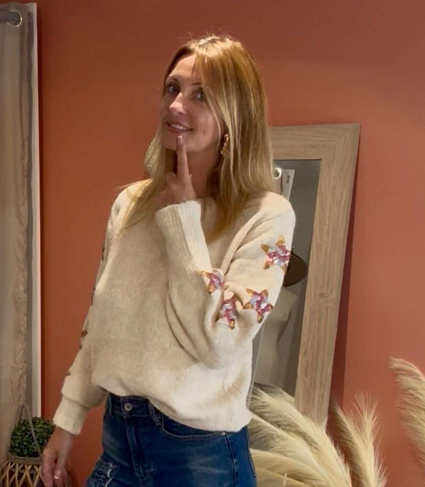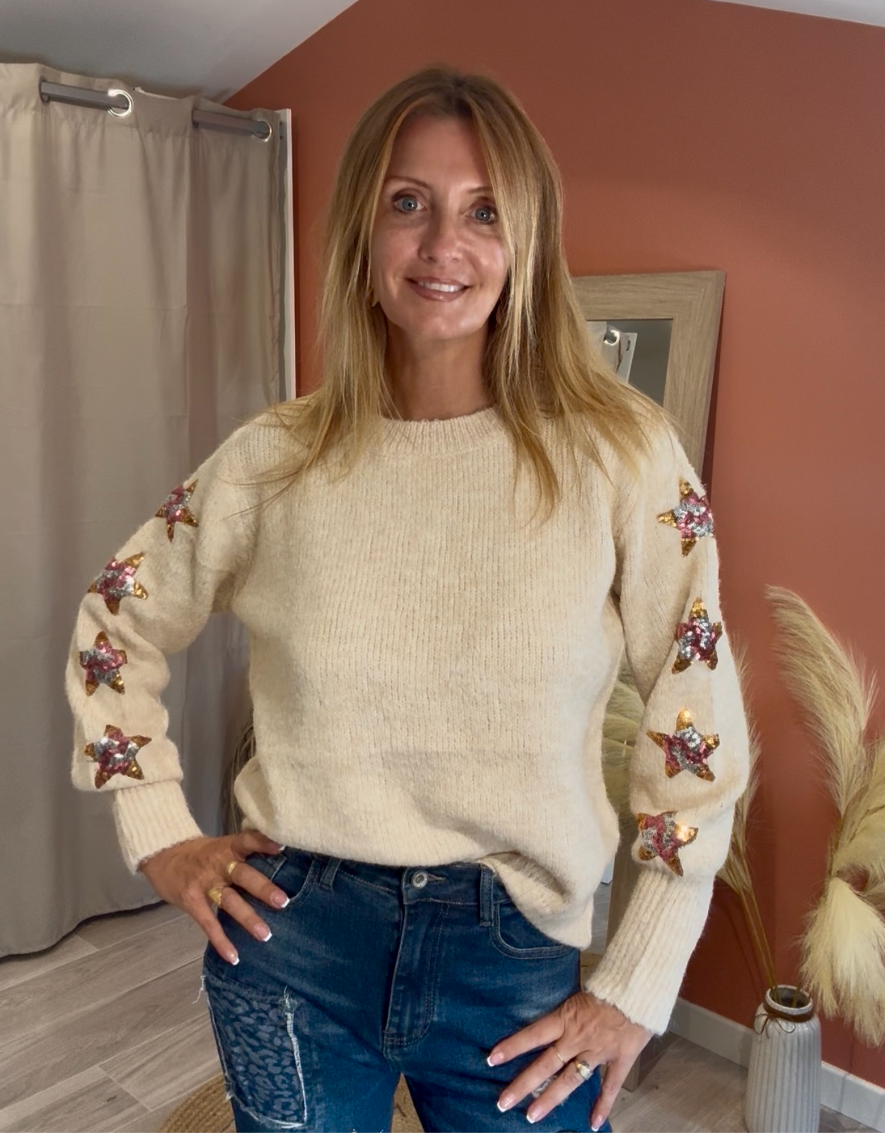 Pull tout doux , qui ne gratte pas , couleur beige avec étoile à strass multicolores ,