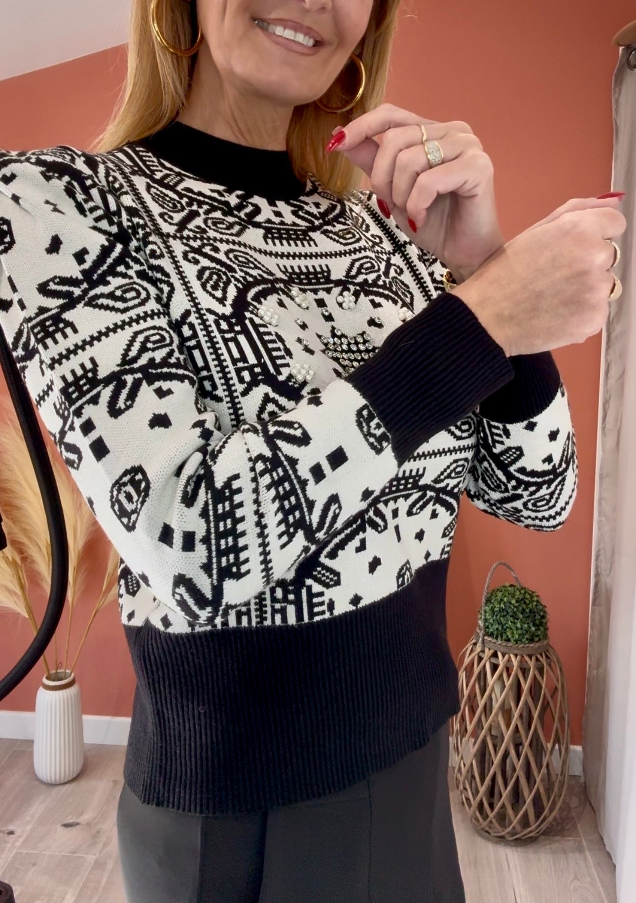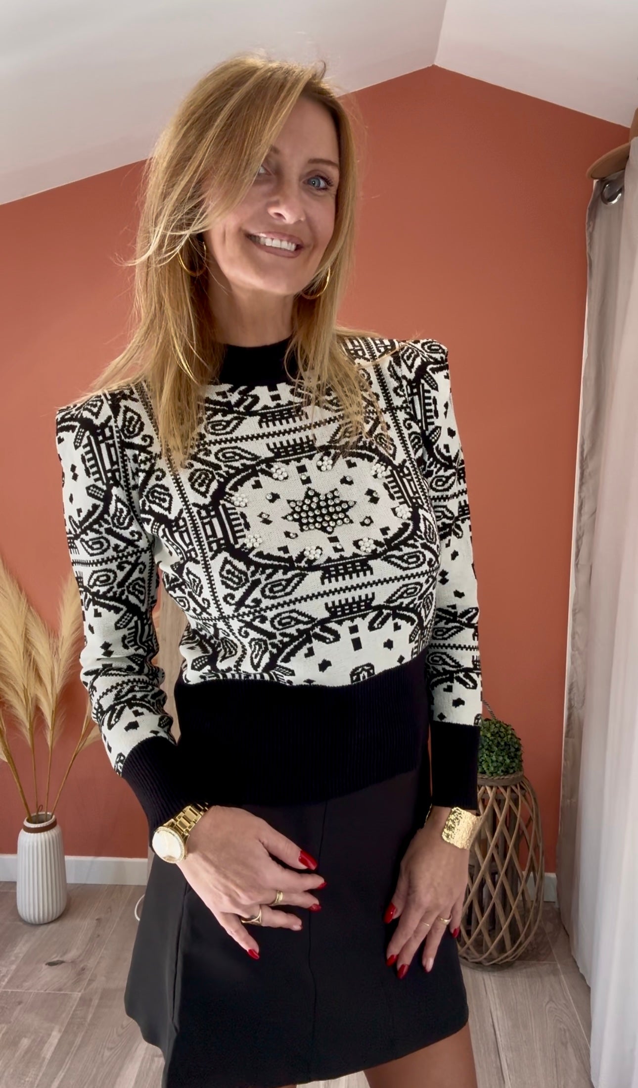 Pull STARMANIA à motifs noir et blanc, strass et perles sur le devant .