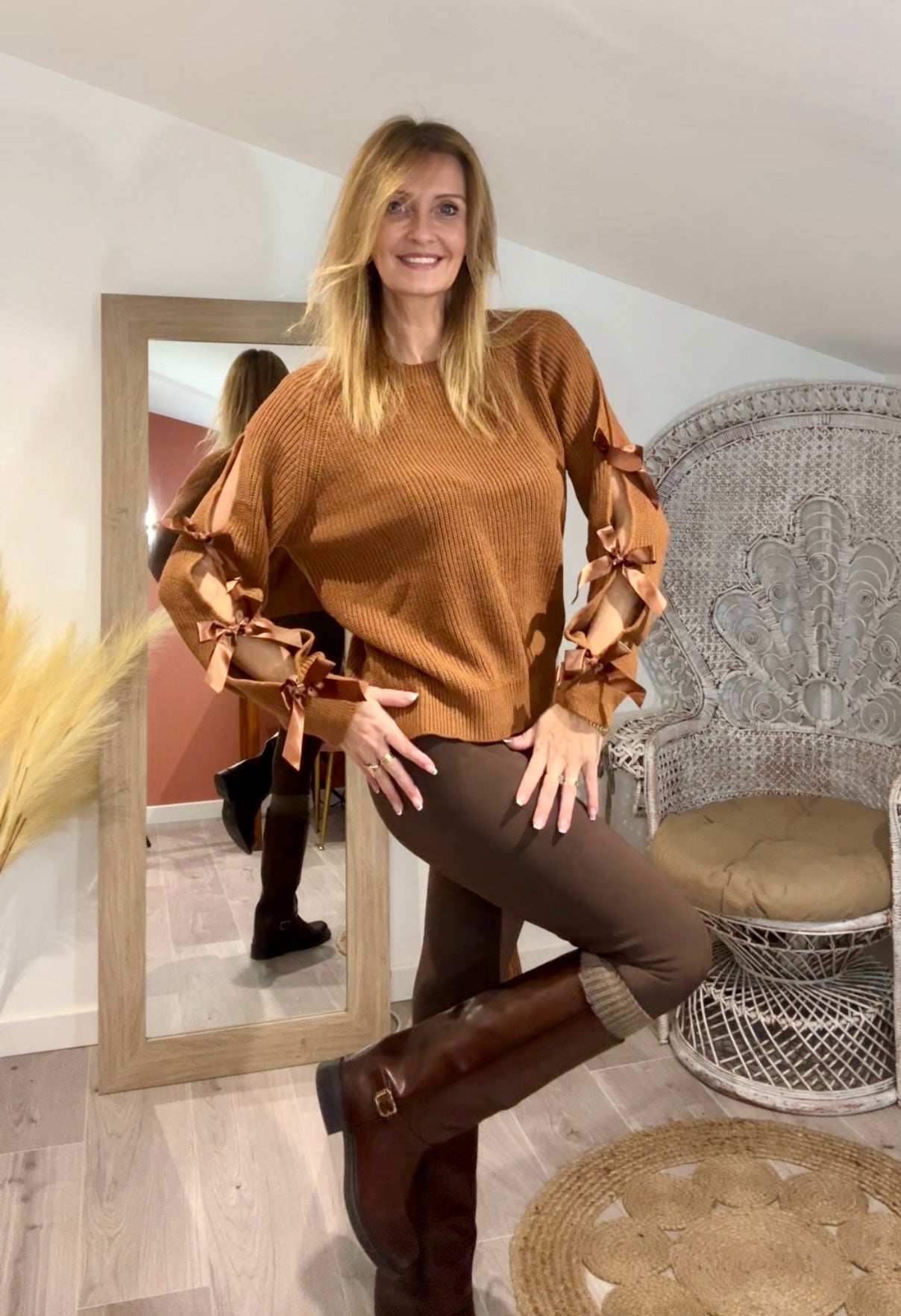 Pull col rond cAmel , manches ouvertes agrémenté de noeuds sur les bras.