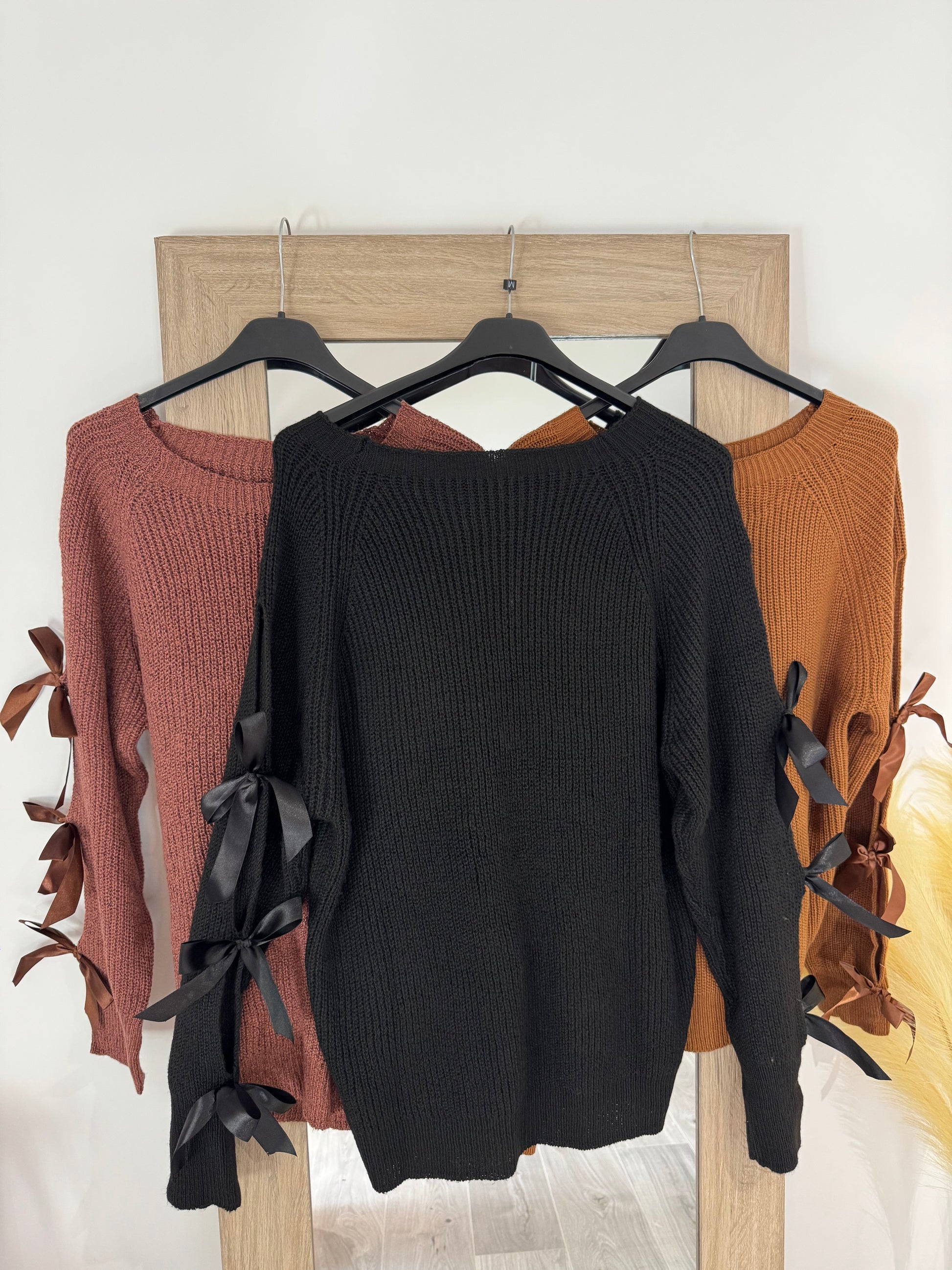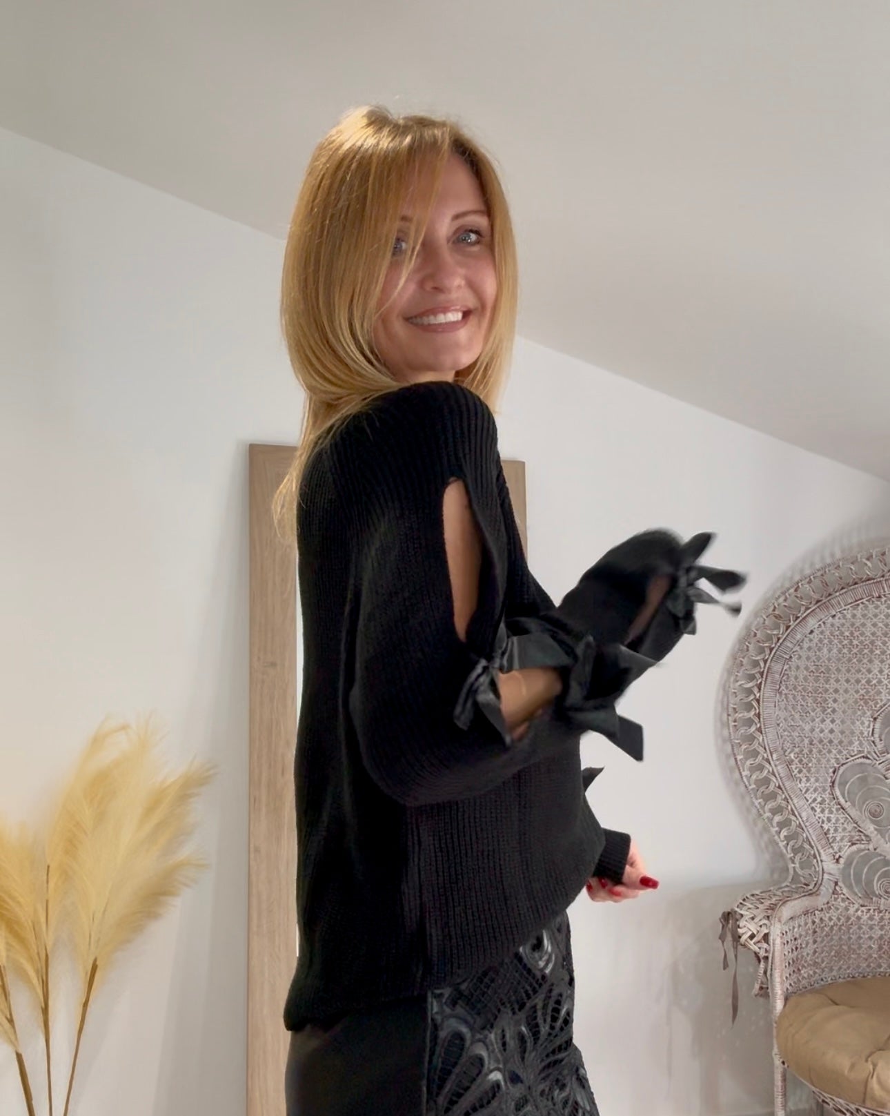 Pull col rond , manches ouvertes agrémenté de noeuds sur les bras.