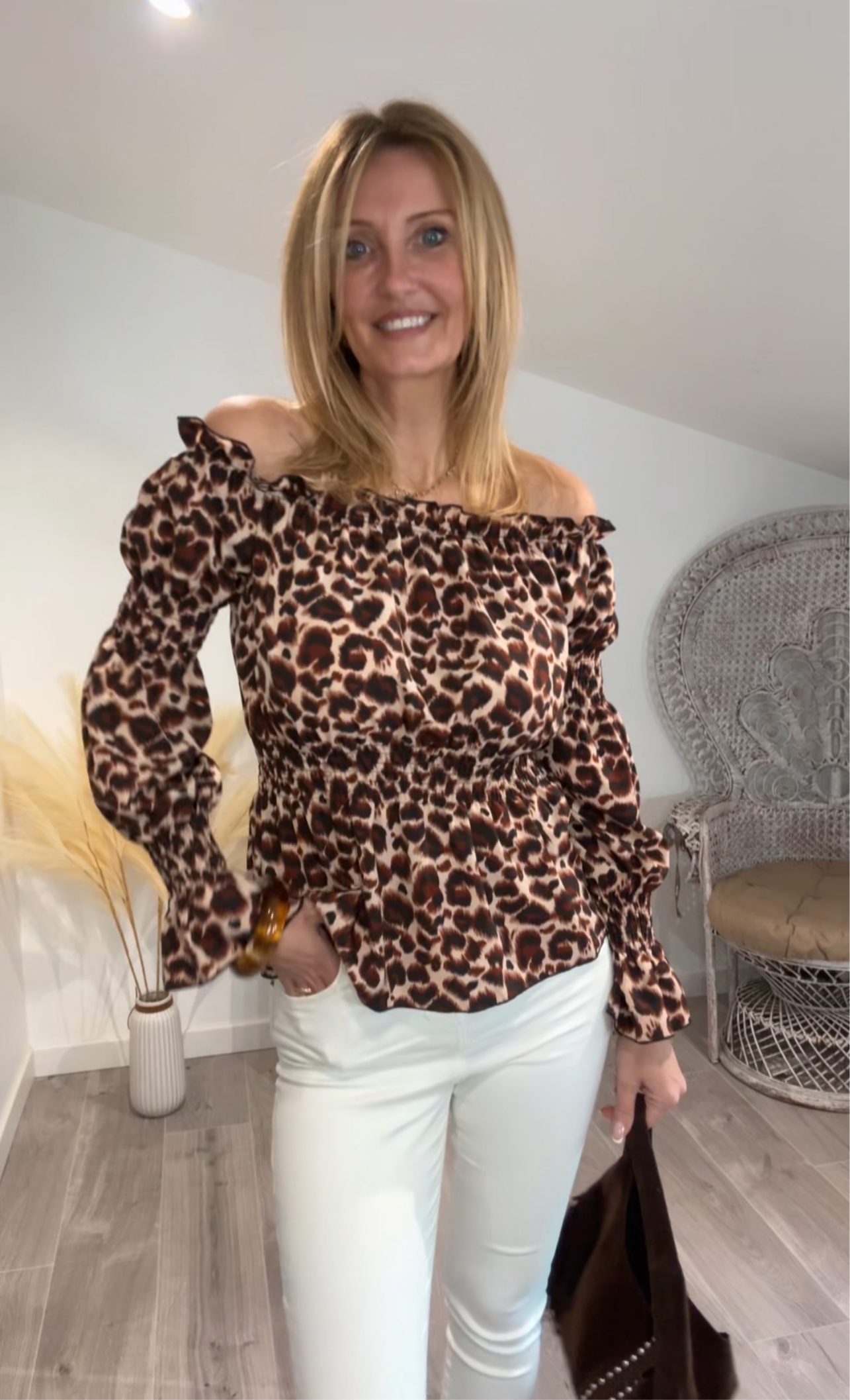 Haut à col Bardot imprimé léopard, parfait pour un look féminin et tendance. Son effet smocké épouse la silhouette tout en assurant un maintien confortable, tandis que les manches lanternes apportent une touche romantique. Idéal à porter aussi bien avec un jean qu’une jupe pour un style chic et affirmé.