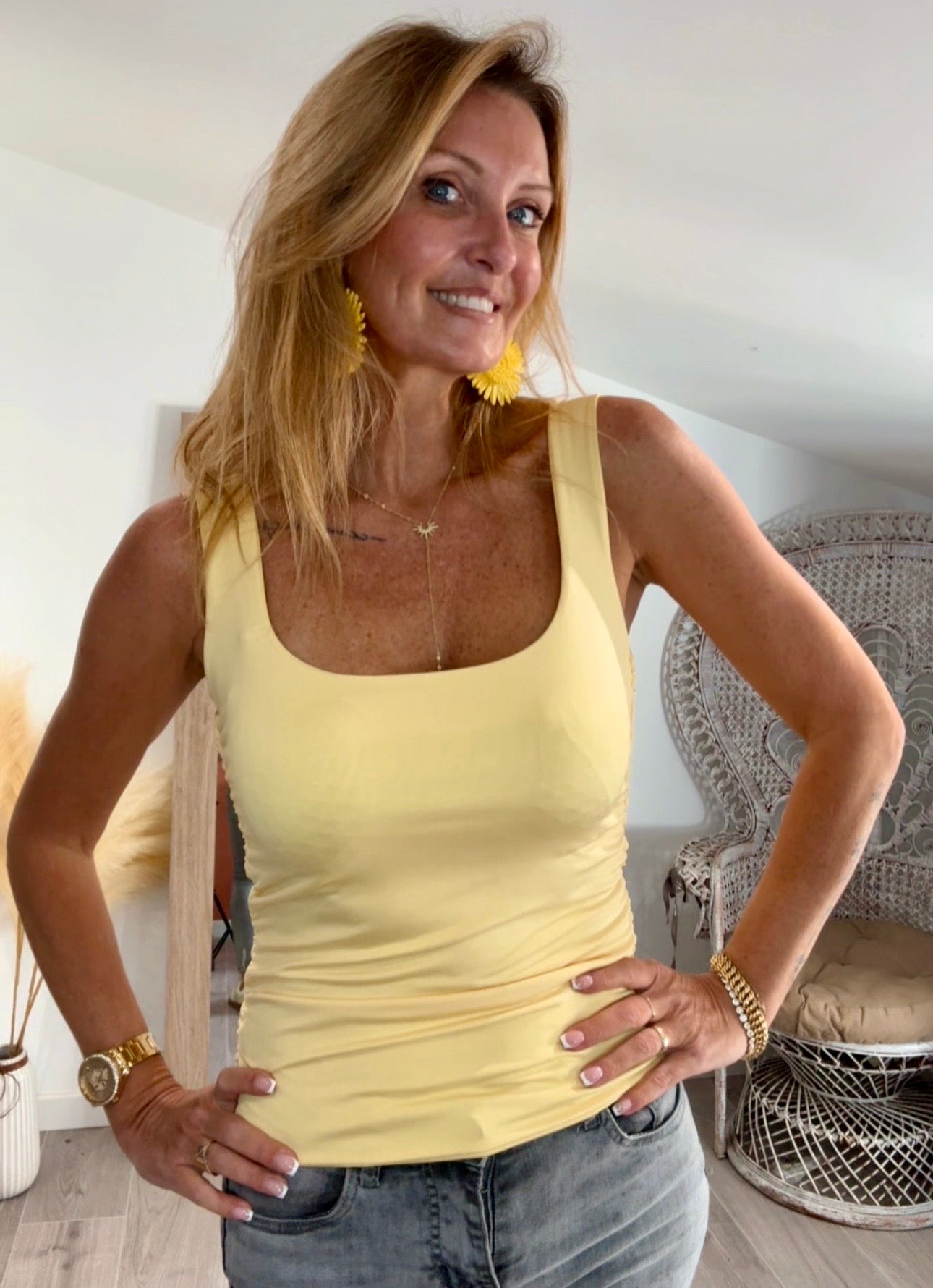 Débardeur plein de pep’s avec sa couleur vitaminé jaune, col et dos carré , matière seconde peau extensible et très agréable au toucher.